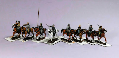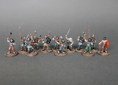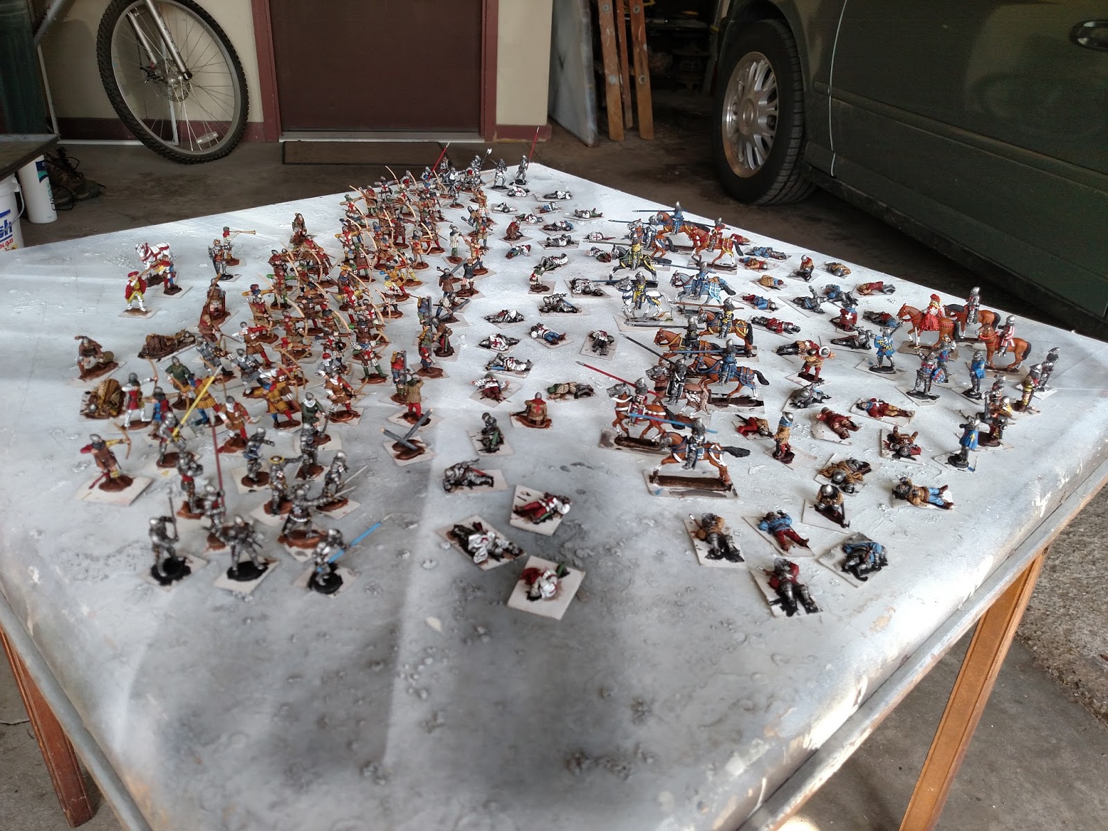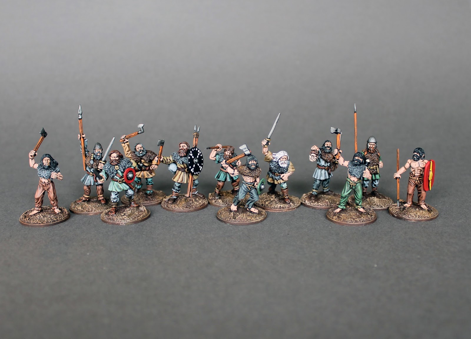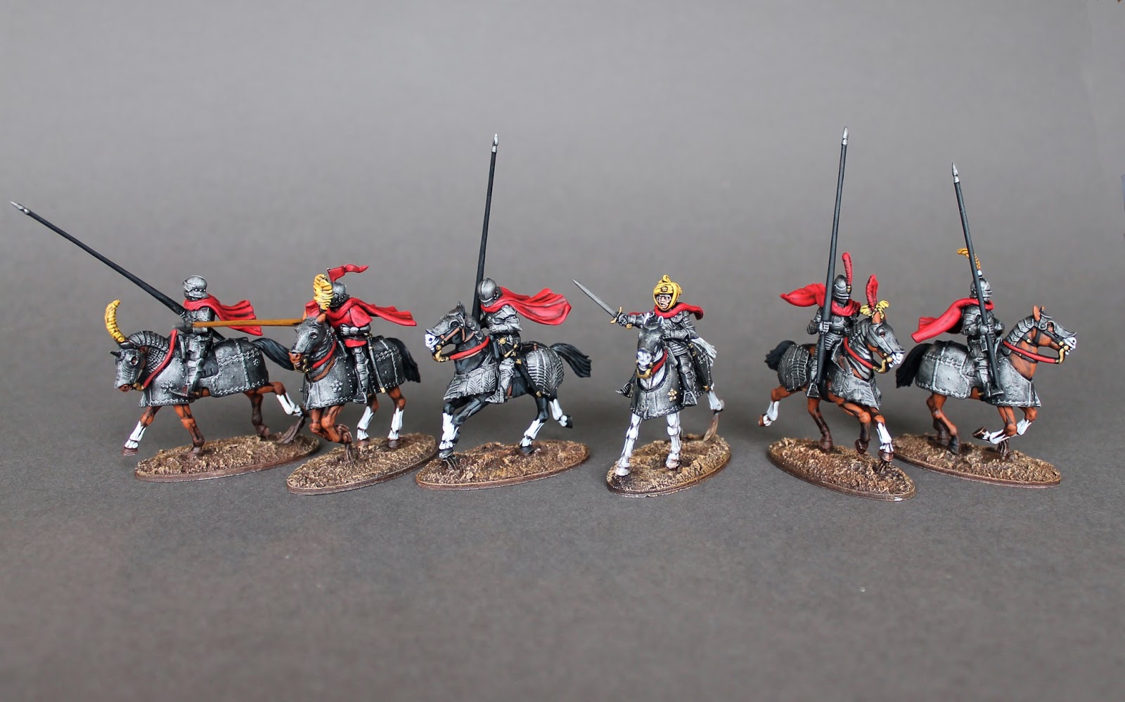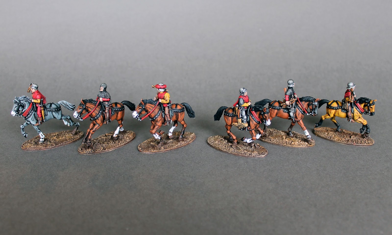 This is an order sent to me by D. Wade Shows of California, who asked for a warband for the Lannister clan from Game of Thrones. The subject matter was a great change of pace from historical figures, yet historical models were what he used to achieve the look. His models are predominately Perry Miniatures, with a unit of wildmen by Blacktree Miniatures. His mounted knights have cloaks taken from another plastic company which add a great deal of personality, methinks.